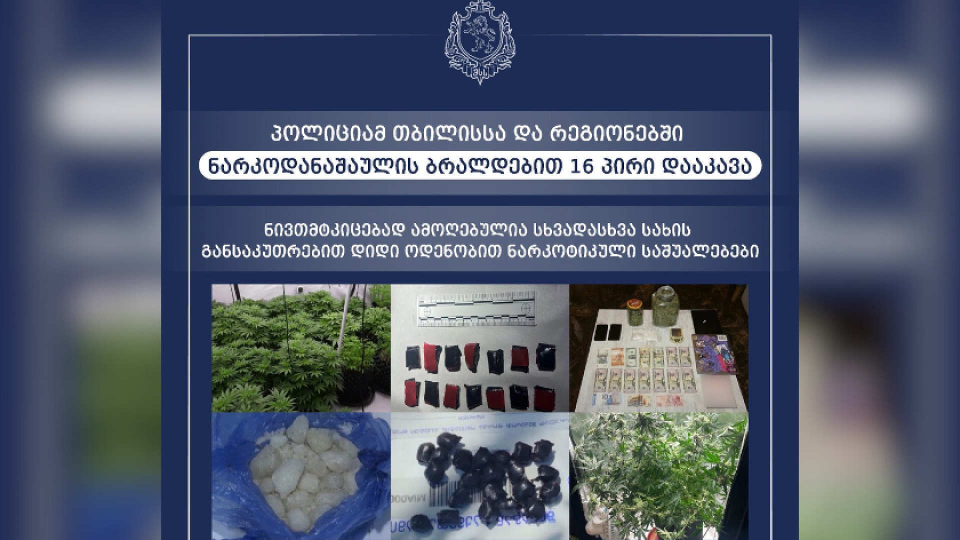 შინაგან საქმეთა სამინისტროს საპატრულო პოლიციის, თბილისის, აჭარის, ქვემო ქართლისა და იმერეთის პოლიციის დეპარტამენტების თანამშრომლებმა, სხვადასხვა დროს ჩატარებული ოპერატიული ღონისძიებებისა და საგამოძიებო მოქმედებების შედეგად ნარკოდანაშაულის ბრალდებით 16 პირი დააკავეს. ინფორმაციას შსს ავრცელებს.