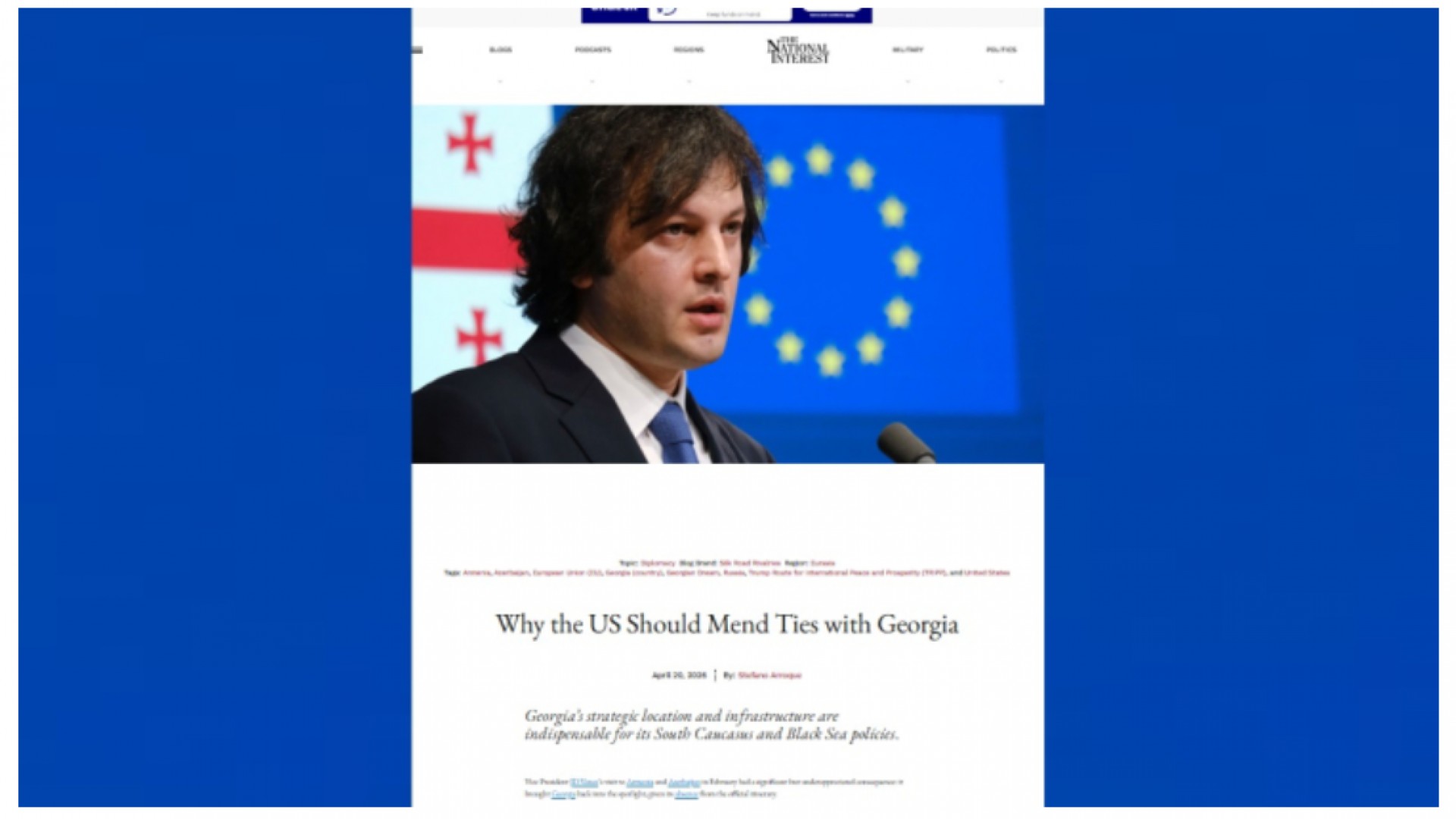 საქართველოს სტრატეგიული მდებარეობა და ინფრასტრუქტურა შეუცვლელია აშშ-ის სამხრეთ კავკასიისა და შავი ზღვის პოლიტიკისთვის, - წერს ონლაინ გამოცემა The National Interest-ი სტატიაში სათაურით: „რატომ უნდა აღადგინოს აშშ-მა ურთიერთობები საქართველოსთან“.