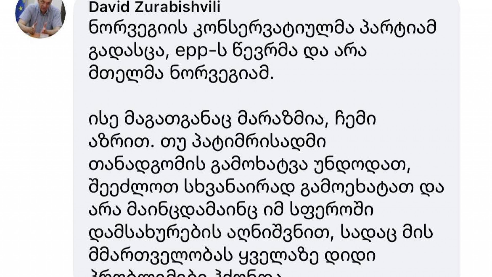 როგორც დავით ზურაბიშვილი სოციალურ ქსელში წერს, სააკაშვილს ჯილდო ნორვეგიის კონსერვატიულმა პარტიამ გადასცა, epp-ს წევრმა და არა მთელმა ნორვეგიამ.