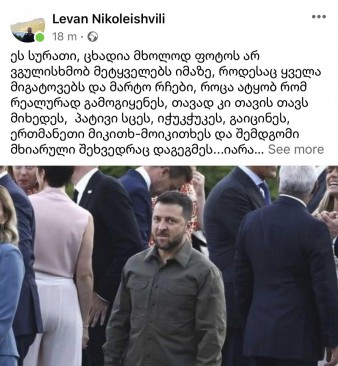 „ეს სურათი, ცხადია მხოლოდ ფოტოს არ ვგულისხმობ მეტყველებს იმაზე, როდესაც ყველა მიგატოვებს და მარტო რჩები, როცა ატყობ რომ რეალურად გამოგიყენეს, თავად კი თავის თავს მიხედეს, პატივი სცეს, იჭუკჭუკეს, გაიცინეს, ერთმანეთი მიკითხ-მოიკითხეს და შემდგომი მხიარული შეხვედრაც დაგეგმეს...იარაღს კი მისცემენ, ალბათ რეზნიკოვს გაუხარდება ისევ, აკი აღნიშნა უკრაინა შესანიშნავი პოლიგონიაო, სამხედრო მრეწველობის განვითარებას ეხმარებაო...ნიშნის მოგებით არ ვამბობ, მაგრამ უმადურობის ფასი ალბათ იგრძნო სურათის გმირმა, სწორედ ამიტომ არის ეს სურათი ასეთი, ვიმეორებ, მხოლოდ ფოტოს არ ვგულისხმობ!“ - წერს ლევან ნიკოლეიშვილი Facebook-ზე.