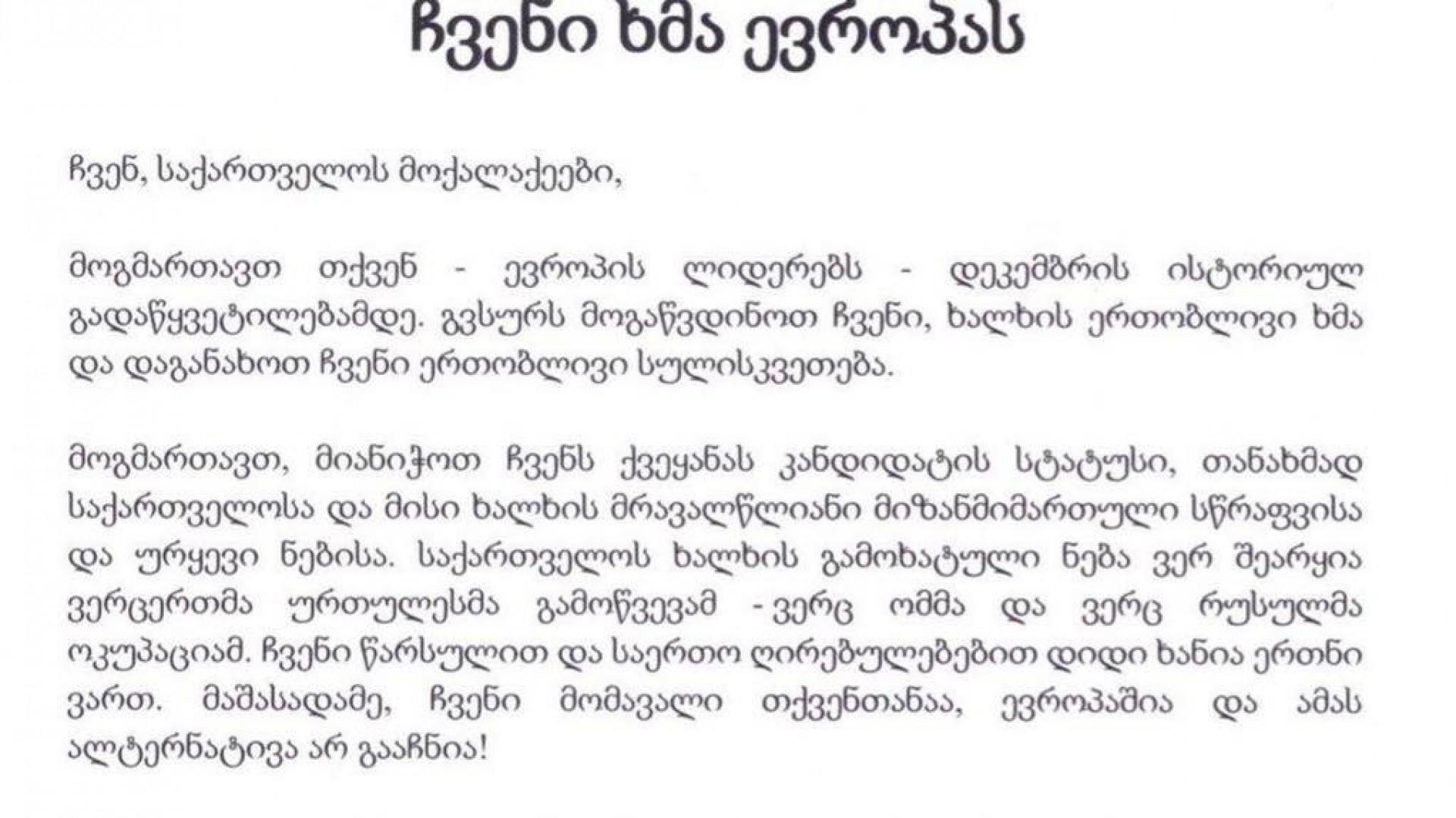 სააკაშვილი აქვეყნებს პრეზიდენტის ინიციატივით დაწყებული კამპანიის „ჩემი ხმა ევროპას“ ფარგლებში ხელმოწერილ პეტიციასაც აქვეყნებს.